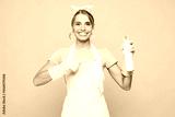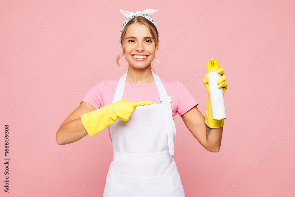Young happy woman wear white apron gloves hold point index finger on surface cleaner spray in bottle while doing housework tidy up isolated on plain pastel light pink background. Housekeeping concept.
