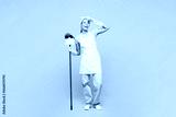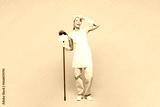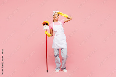 Full body young woman wear white apron gloves hold funny mop in glasses and hat pov human man while doing housework tidy up look aside isolated on plain pastel pink background. Housekeeping concept.
