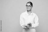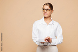 Young successful employee IT business woman corporate lawyer wear classic white shirt glasses work in office hold use digital tablet pc computer look aside isolated on plain beige background studio.