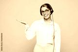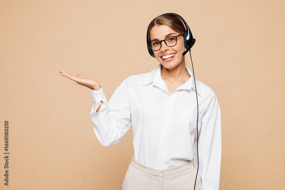Employee operator business woman wear white classic formal shirt set microphone headset for helpline assistance work at call center office point hand aside on area isolated on grey background studio.