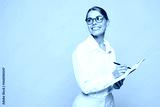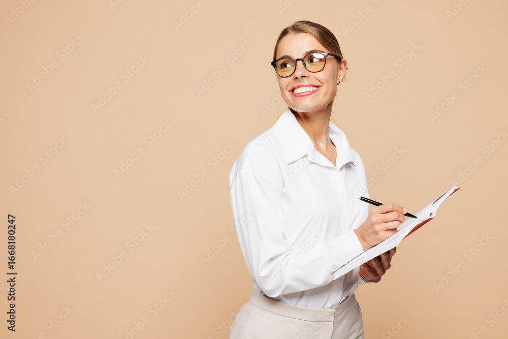 Young successful employee business woman corporate lawyer in classic formal white shirt glasses work in office hold notebook taking notes look aside isolated on plain beige background studio portrait.