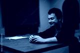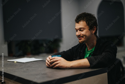 A cheerful young man holding a cup of beverage while sitting at a table, showcasing a relaxed indoor setting.