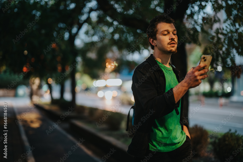 Man standing outdoors in an urban area, focused on his smart phone, with a blurry background of city lights and foliage at dusk.