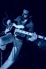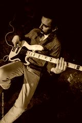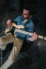 A man playing a bass guitar in a studio setting, emphasizing musical talent and performance.