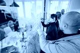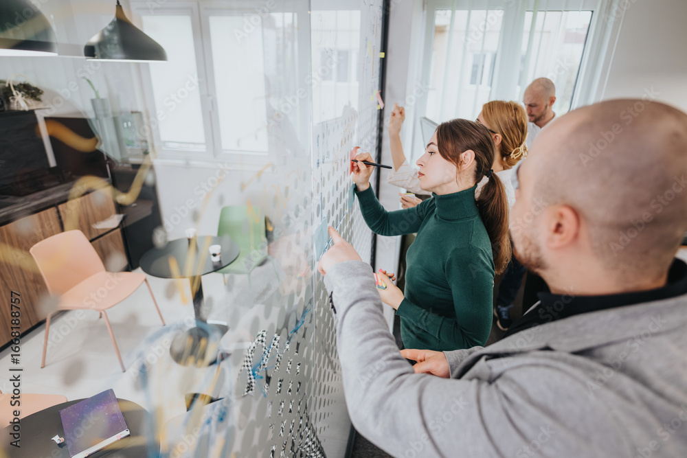 Colleagues collaborating and brainstorming ideas on a glass board in an office environment, engaging in problem-solving and teamwork.