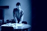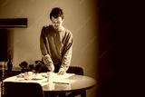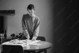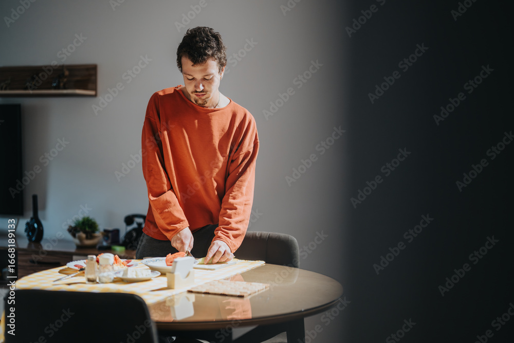 A young man in casual clothing is slicing food items on a table in a cozy interior space, creating a homely atmosphere
