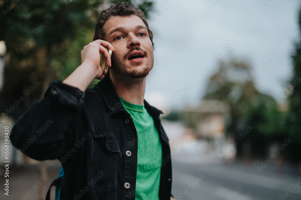 A teenager smiling and talking on a smart phone, standing in an urban area, portraying communication, enjoyment, and modern lifestyle in a casual environment.