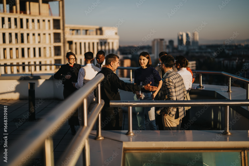 Group of diverse business people engage in a creative brainstorming session on a rooftop at sunset, overlooking the cityscape. Collaboration and multicultural teamwork in a modern urban environment.