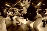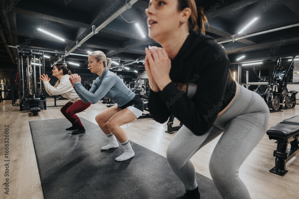 A dynamic image of women in a gym setting actively engaging in group fitness exercises, focusing on physical health, strength, and determined effort.