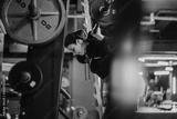 Focused woman lifting weights with barbell during a squat exercise in a contemporary gym. The environment emphasizes strength training and fitness dedication.