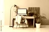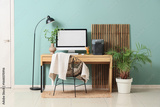 Comfortable workspace with modern computer, portable power station and houseplants near blue wall