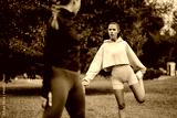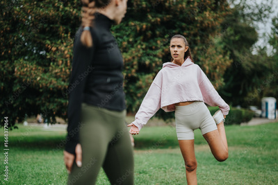 Two women in active wear engaging in a stretching exercise in a lush green park, preparing for their workout. They exhibit focus and determination, demonstrating fitness and a healthy lifestyle.