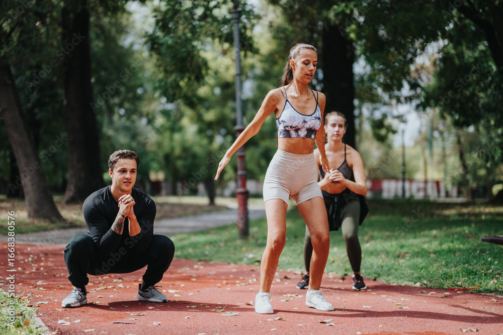Three friends engage in fitness activities at a park on a cloudy day, performing exercises such as squats and stretches.