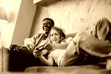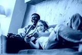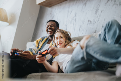 Two individuals bond over playing video games on a sofa, sharing joyful moments of fun and relaxation, exemplifying leisure and entertainment at home.