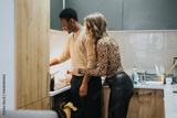 A couple is seen cooking in their home kitchen, enjoying the moment as they prepare a meal, depicting teamwork, togetherness, and a cozy domestic environment.