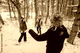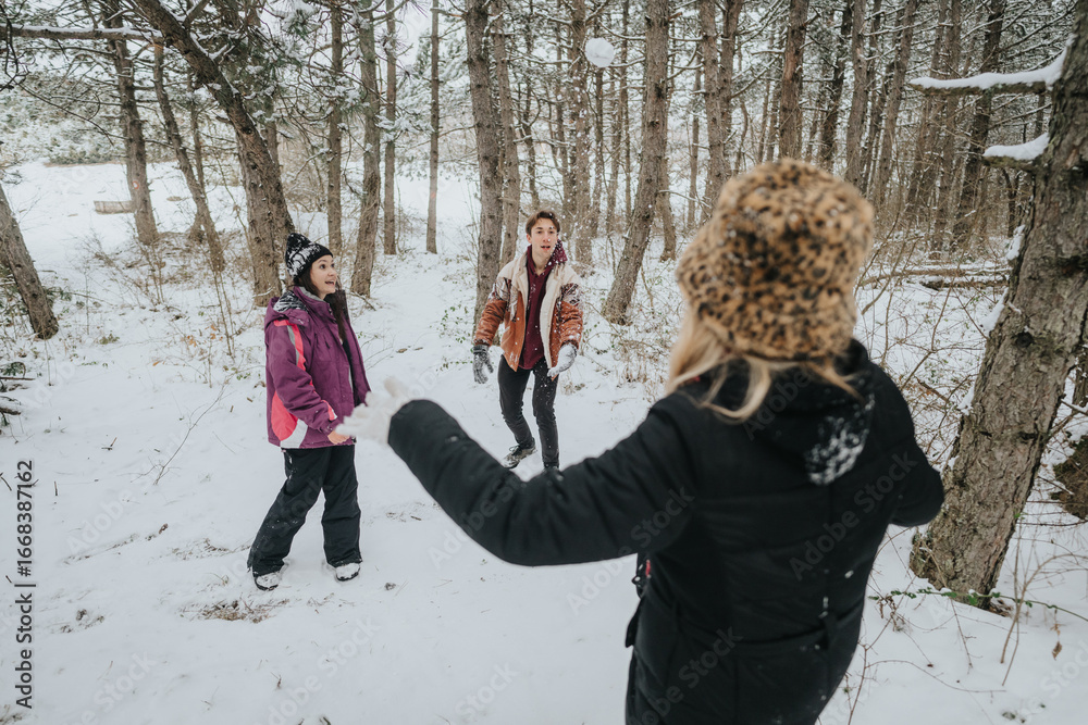 Three friends dressed in winter clothes are playing and having fun in a snowy forest, enjoying the natural atmosphere and the cold setting during wintertime.