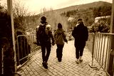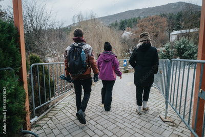Three people dressed in warm clothing strolling together on a cobblestone path surrounded by trees and railings in a scenic outdoor area