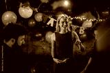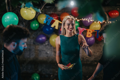 A cheerful woman enjoying a birthday party with balloons and festive decorations, interacting with friends and creating a lively atmosphere, depicting joy and celebration.