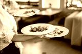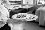 Waiter serving three gourmet dishes in a modern restaurant. Plates feature grilled meat, pasta, and vegetables. Professional food presentation and service concept