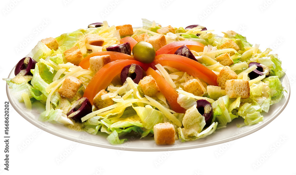 prato com salada de alface, rúcula, tomate e azeitona isolado em fundo transparente