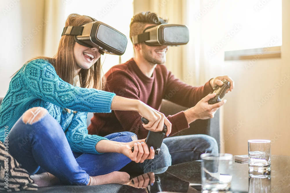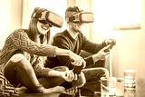 Young happy friends playing video games wearing virtual reality glasses in their apartament
