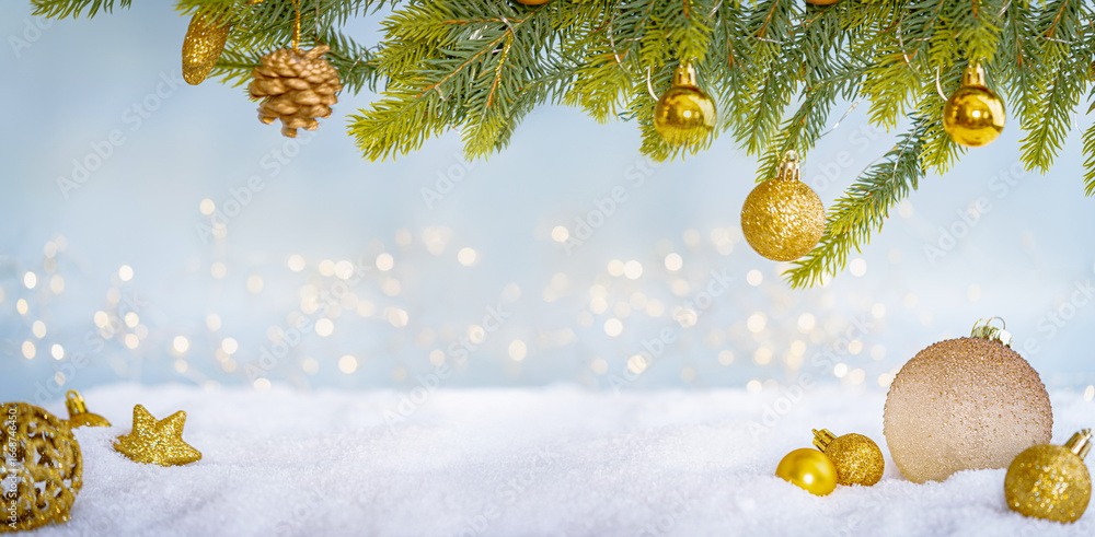 Christmas Holiday background with snow, fir tree and decorations with christmas light behind. Christmas golden balls on a winter festive background.