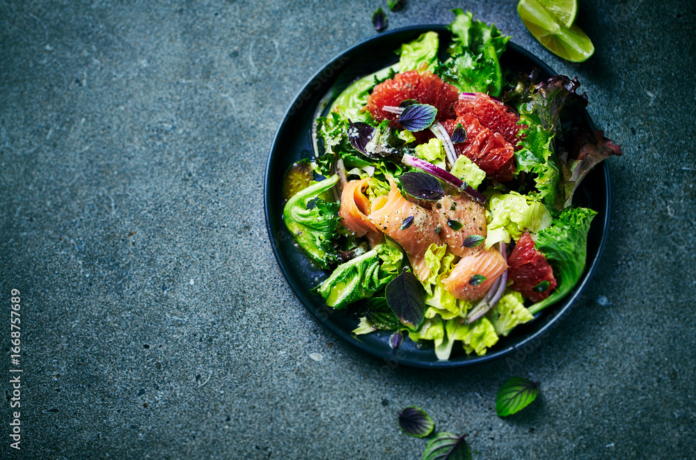 Gourmet salmon and grapefruit salad with herbs and parmesan-lemon dressing