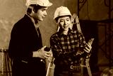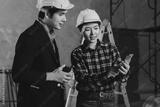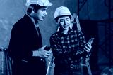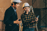 Construction manager and engineer dressed in orange work vests and hard helmets explore construction documentation on the building site near the steel frames