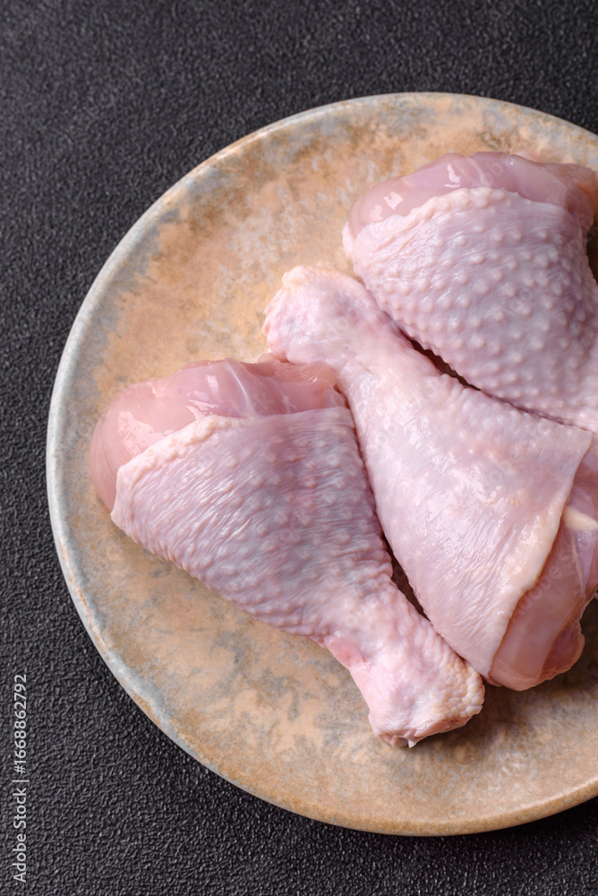 Raw chicken or turkey legs as a food background for cooking on a barbecue or grill. Chicken raw legs