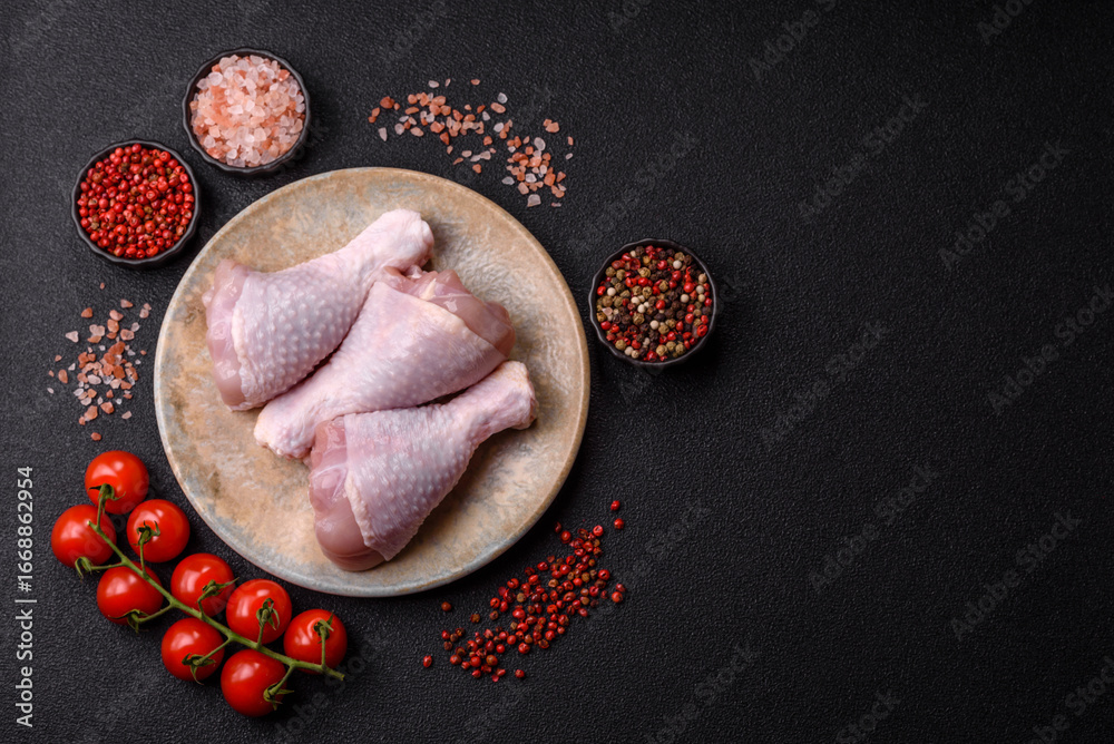 Raw chicken or turkey legs as a food background for cooking on a barbecue or grill. Chicken raw legs