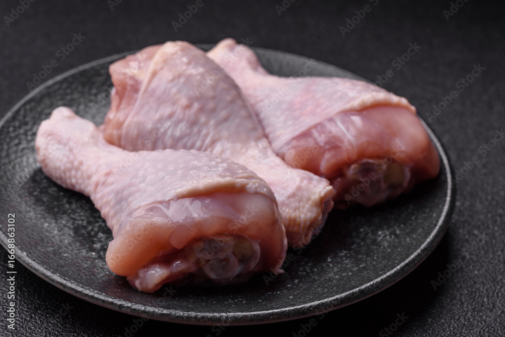 Raw chicken or turkey legs as a food background for cooking on a barbecue or grill. Chicken raw legs
