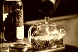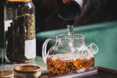Glass teapot with amber tea being filled from black kettle. Steam rises. Loose leaf tea jar and ceramic cups on table. Cozy tea brewing scene with artisanal touch