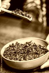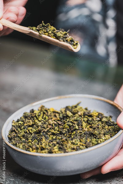 Close-up of loose leaf tea in a ceramic bowl with a wooden spoon. Curled green and brown leaves suggest oolong or green tea. Natural light, soft focus background