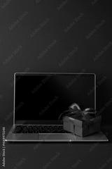 Elegant workspace vertical setup featuring a laptop and a gift box with red ribbon, reflecting themes of modernity, business appreciation, and festive celebration in a professional setting