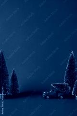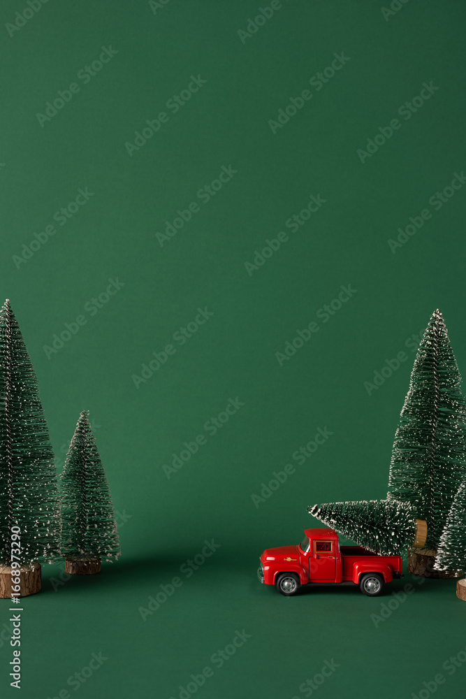 Charming vertical holiday scene featuring a toy red truck carrying bundled Christmas trees amidst firs