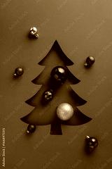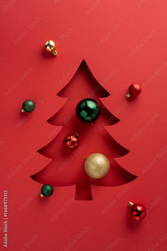 A vertical festive red backdrop featuring a cutout Christmas tree decorated with colorful ornaments