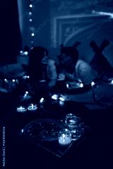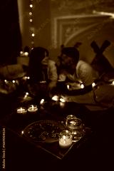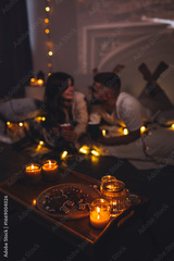Cozy romantic evening, home weekend In bed for a loving couple. Candles, movies, hot chocolate with marshmallow, popcorn. Beautiful young man and woman enjoying relationship, having fun, laughing