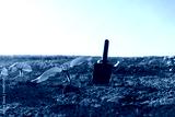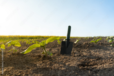 Gardening at sunrise with a shovel beside young plants in a field under a clear blue sky
