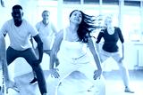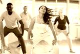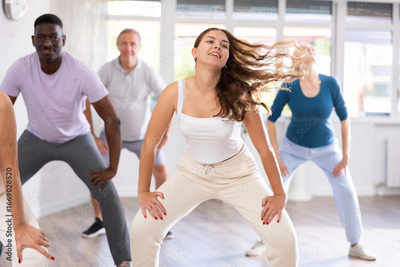Cheerful sporty young girl having fun and dancing hip hop during workout in group dance class for adults