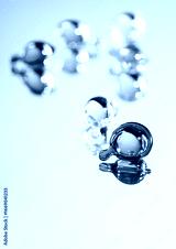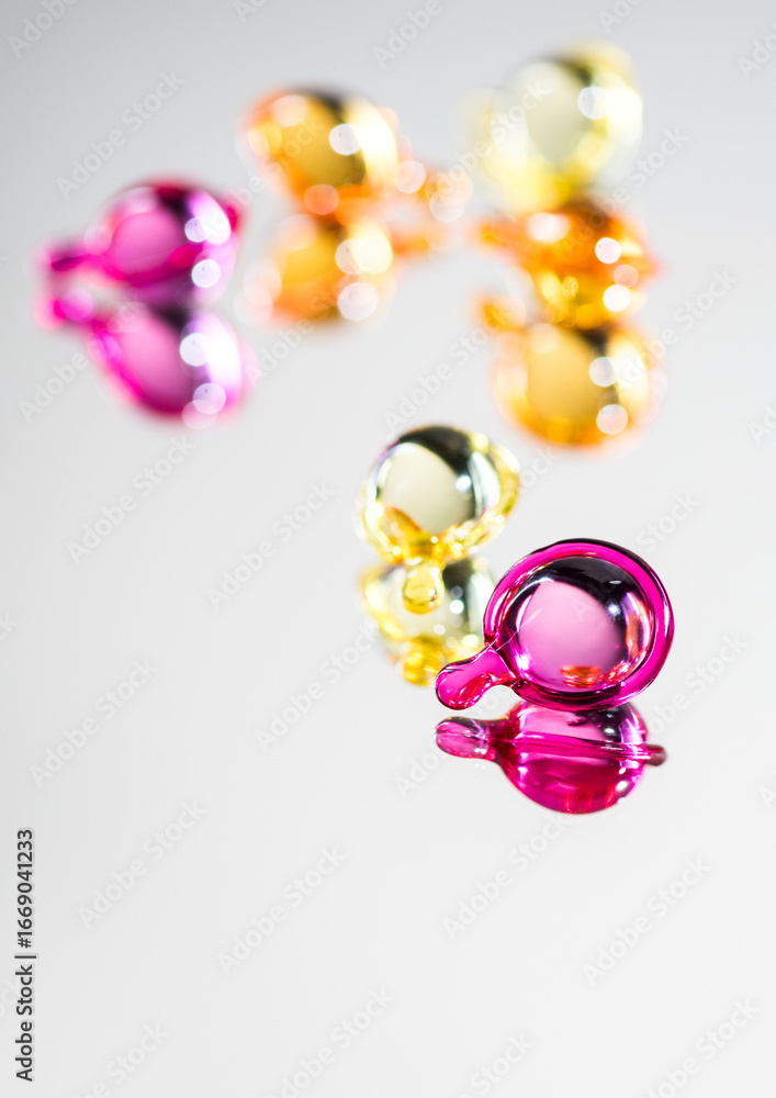 Cosmetic capsules for face or hair care, colorful liquid-filled capsules, oil, serum, pink and yellow varieties, glossy, reflective surface. Capsules background, vibrant, modern aesthetic, vertical