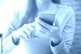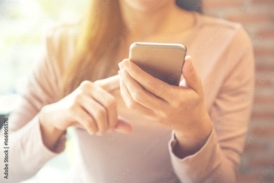 Woman hand holding smartphone at modern coffee shop, She using application on mobile phone.