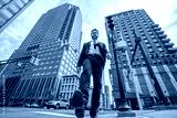 Business man in Manhattan. Business success in big city. Businessman go to success. Successful deal. Low angle. Business success. Busy city street. Successful businessman in New York city street