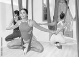 Smiling young girl practicing aerial yoga in group in modern fitness studio, doing butterfly pose sitting in hanging hammock with her back to other women holding their hands