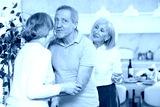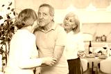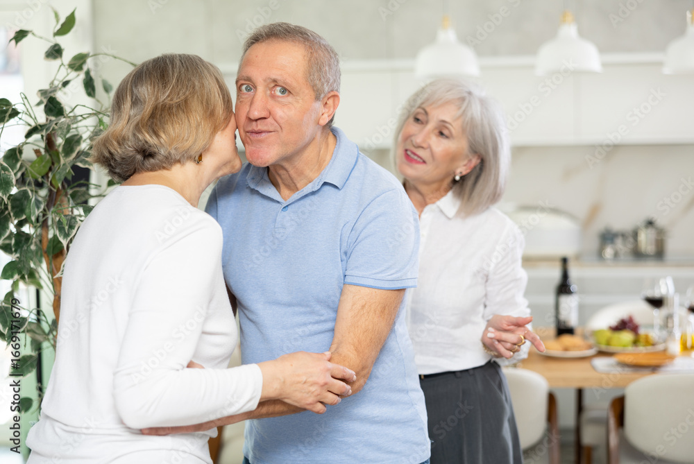 Two elderly couples warmly welcome each other as they gather for a festive holiday dinner in the home