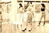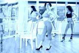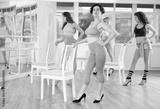 Active female dancer with group of women of different ages practicing strip plastic movements near chair in light training hall during dancing classes