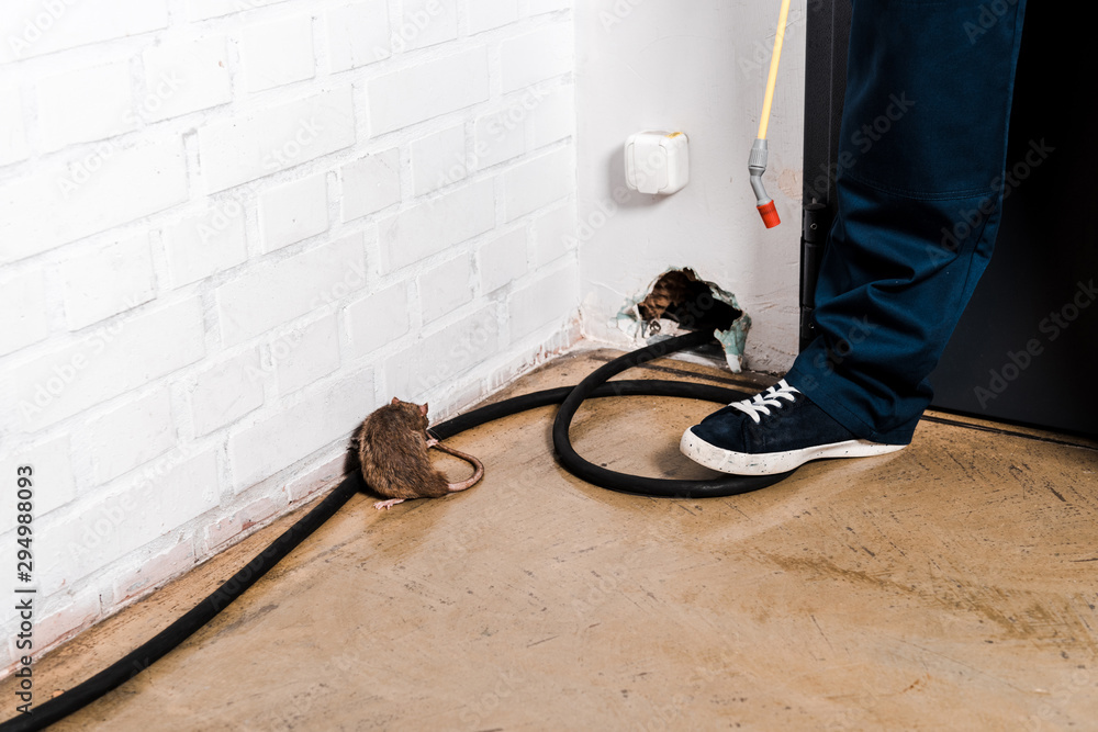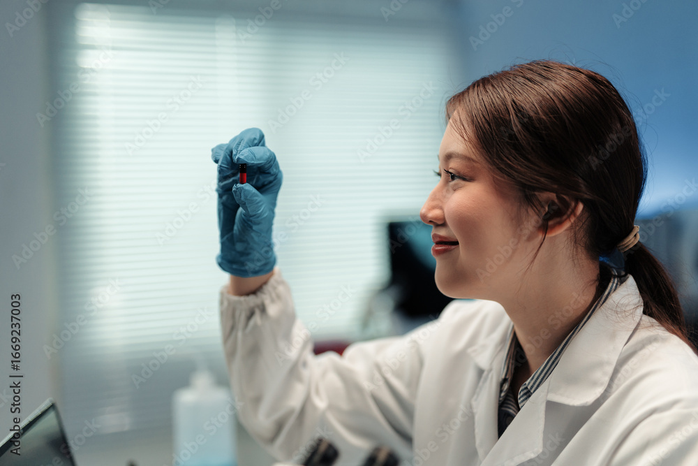 Smiling scientist examining a red and black capsule while conducting research in a modern medical laboratory filled with advanced equipment