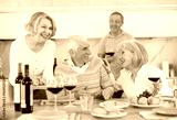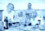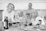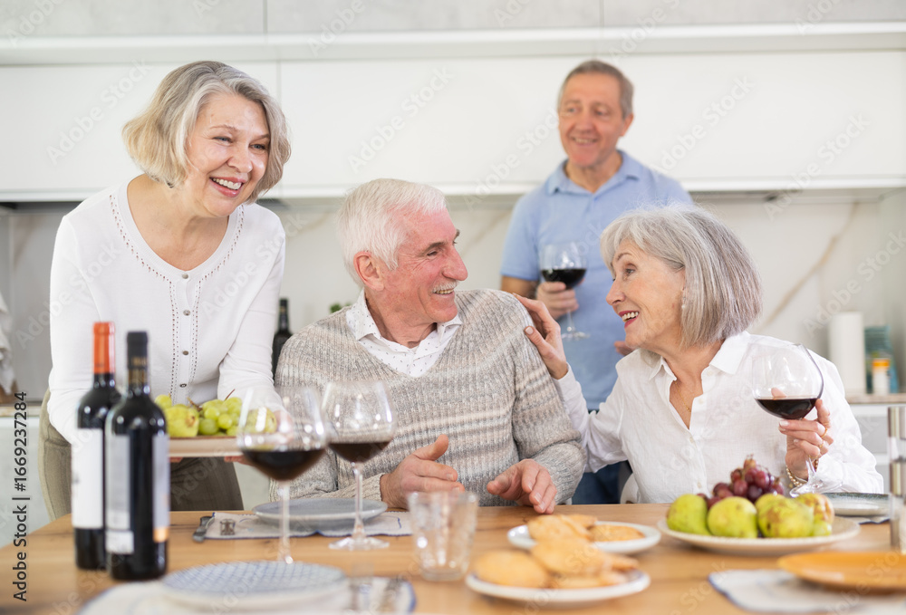 During friendly gatherings in kitchen, elderly woman sets table, serves large plate of fruit, treats elderly friends.