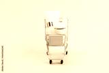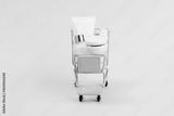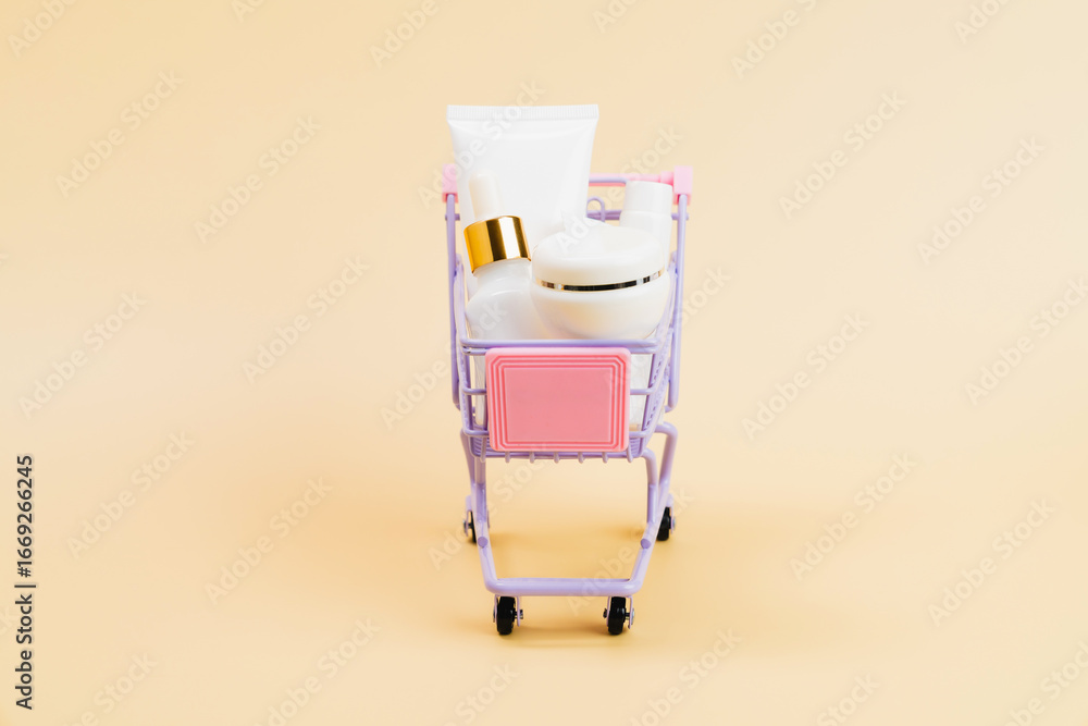 Cosmetic bottles with blank labels in a shopping cart, placed against a beige background for mockup purposes.