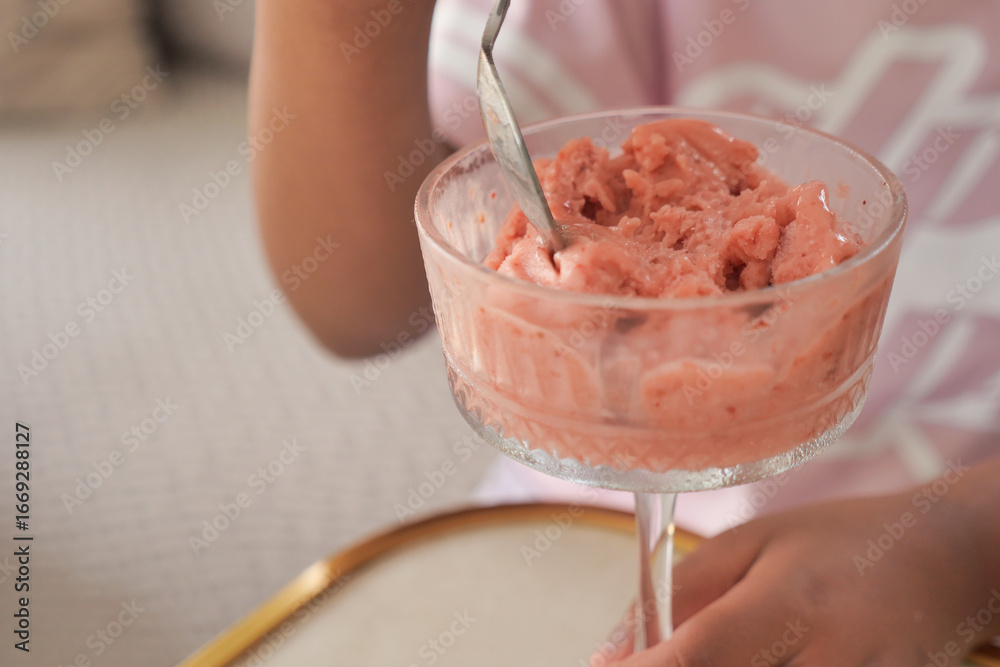 A child savors a bowl of pink ice cream in a comfortable home environment