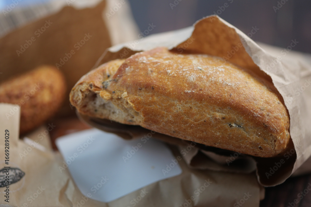 Freshly baked bread in a rustic paper bag on a wooden table